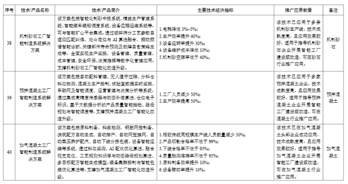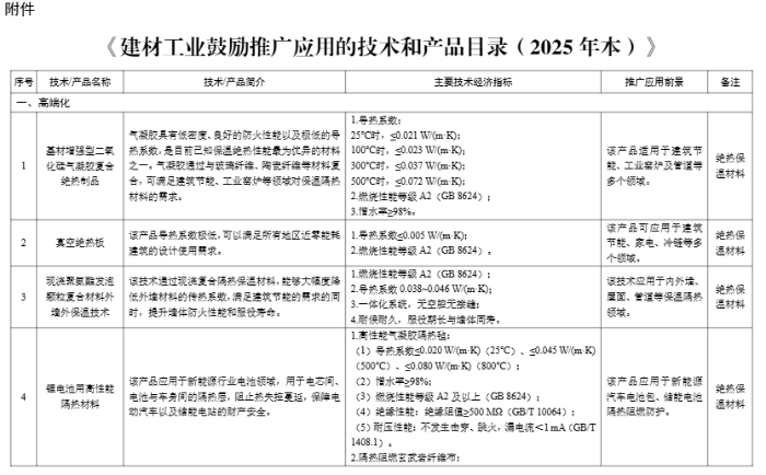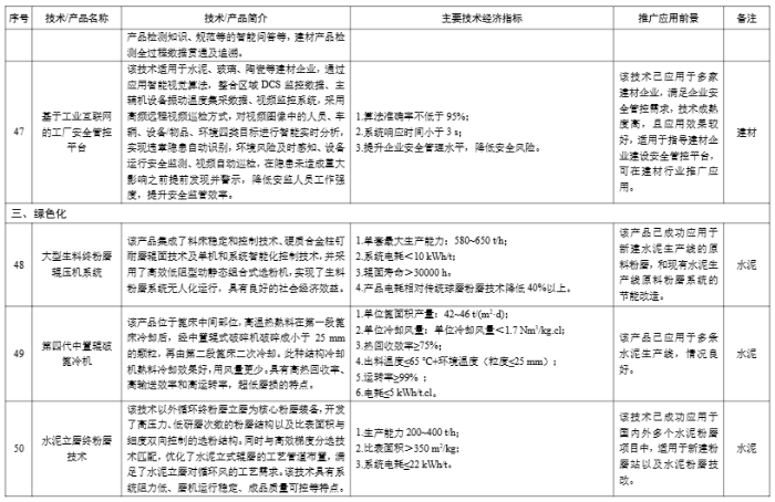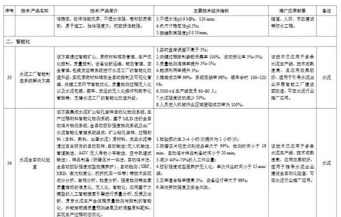新版目录共包含67项技术和产品。其中,列入“高端化”的技术和产品共32项,包括基材增强型二氧化硅气凝胶复合、绝热制品等;“智能化”技术和产品共15项,包括水泥工厂智能制造系统解决方案、水泥全自动化验室等;“绿色化”技术和产品共20项,包括大型生料终粉磨辊压机系统、第四代中置辊破篦冷机等。