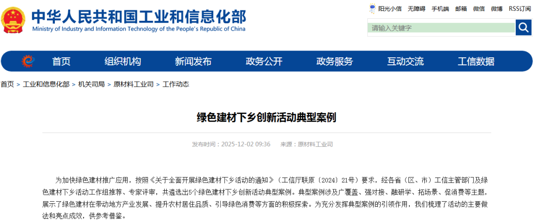 近期,工业和信息化部发布绿色建材下乡创新活动典型案例,中国建筑材料联合会会同中国建材市场协会、中国建筑装饰装修材料协会等单位组织的绿色建材推广暨以旧换新行动成功入选。