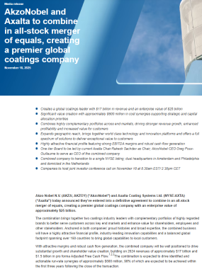 11月18日,荷兰阿克苏诺贝尔(AkzoNobel)发布公告:公司和美国艾仕得(Axalta)今天宣布,他们已经达成了一项最终协议,以平等的全股票合并方式合并,创建一个企业价值约250亿美元的全球一流涂料公司。 公告说:此次合并将两家涂料行业领导者与备受推崇的品牌互补组合结合在一起,以更好地服务于主...